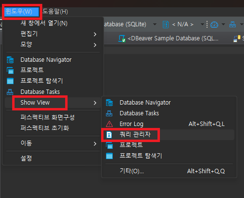 Window (윈도우) => Show View => Query Manager (쿼리 관리자)