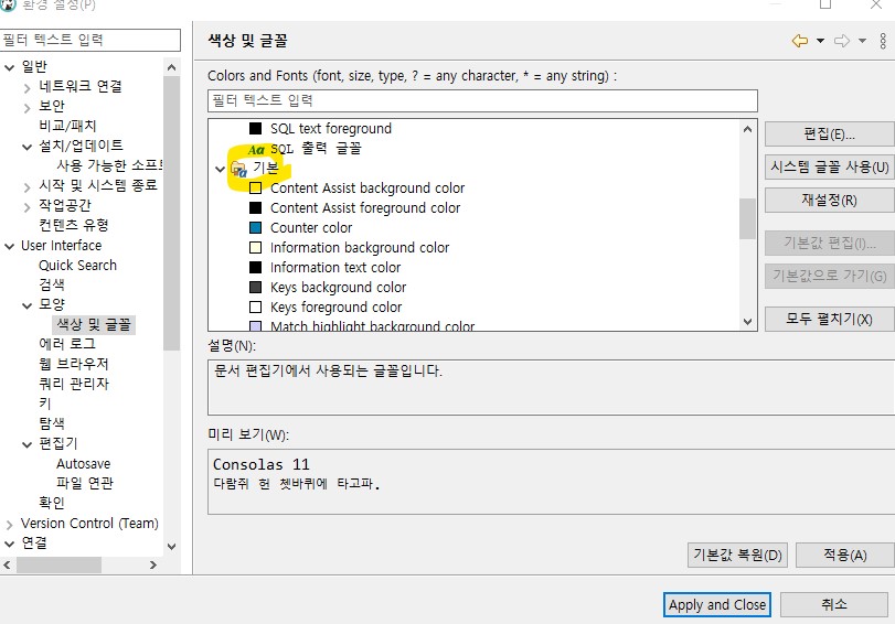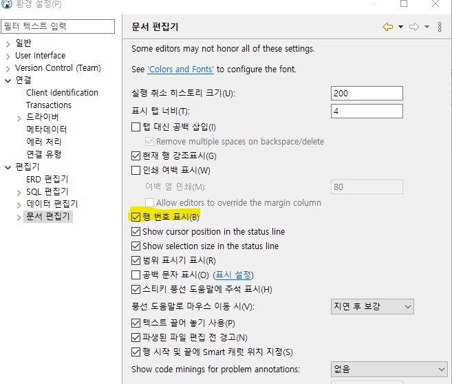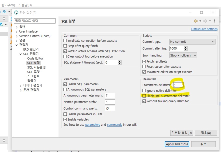 윈도우 > 설정 > 편집기 > SQL 편집기 > SQl 실행